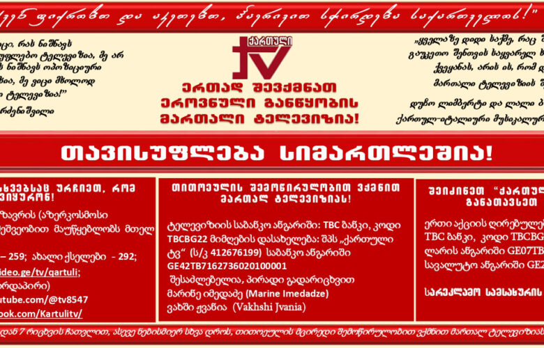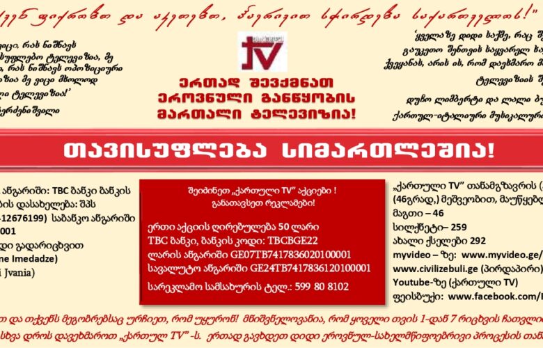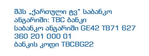 ყველას, ვისაც სურს გვერდში დაუდგეს ტელეკომპანია “ქართულ TV” -ს . ტელევიზიის საბანკო ანგარიშია: TBC ბანკი ბანკის კოდი TBCBG22 მიმღების…