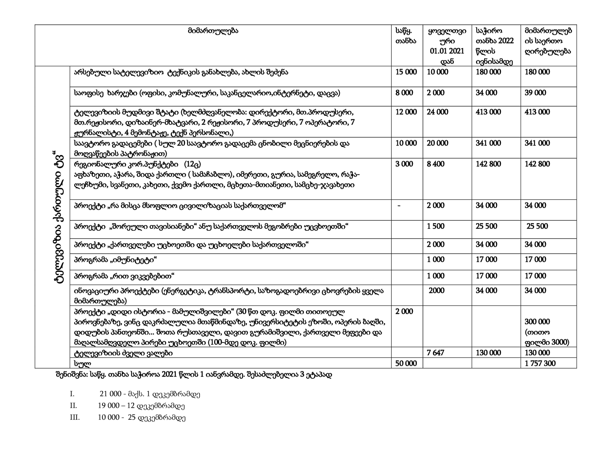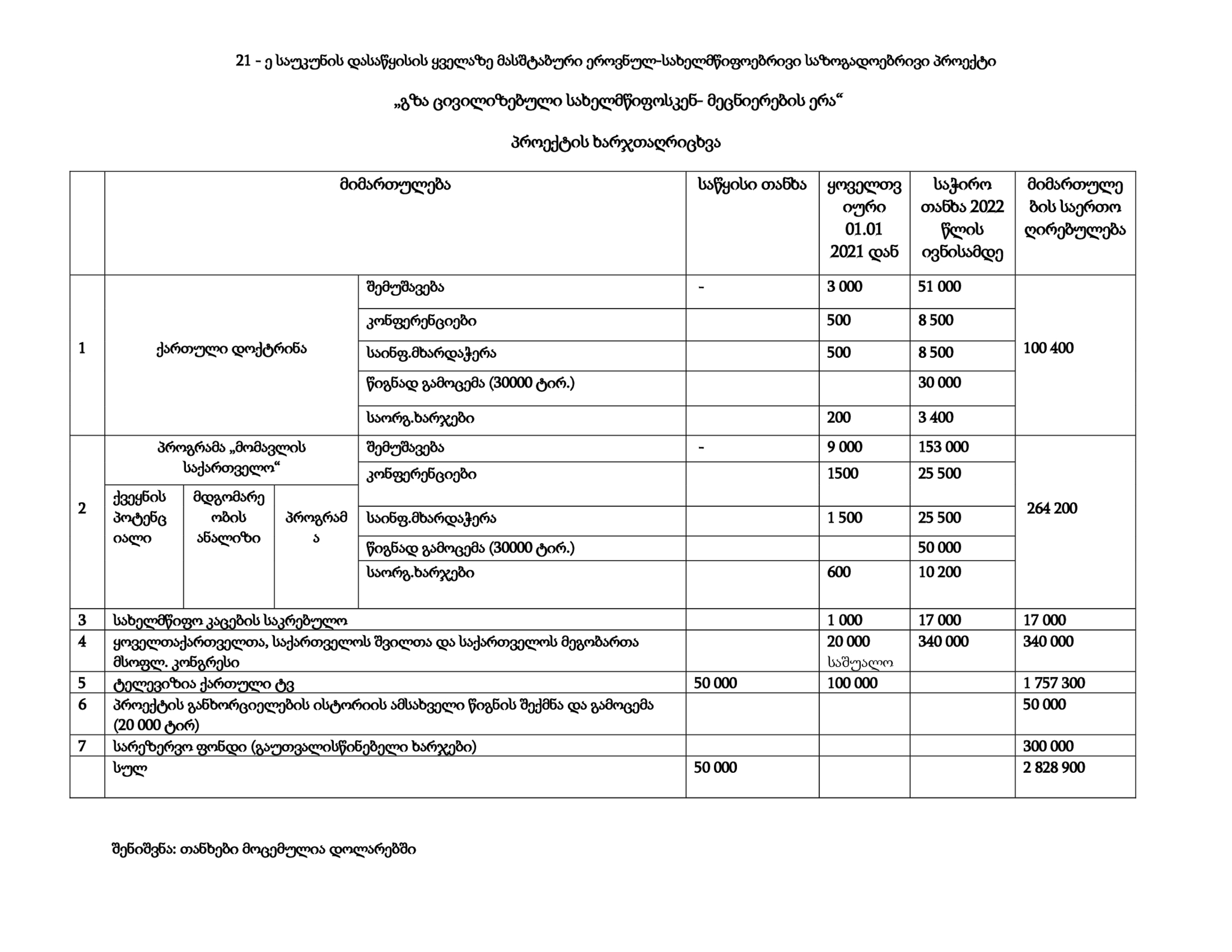 პროექტის ხარჯთაღრიცხვა (PDF იხ. პროექტი: „მეცნიერების ერა - გზა ცივილიზებული სახელმწიფოსკენ“